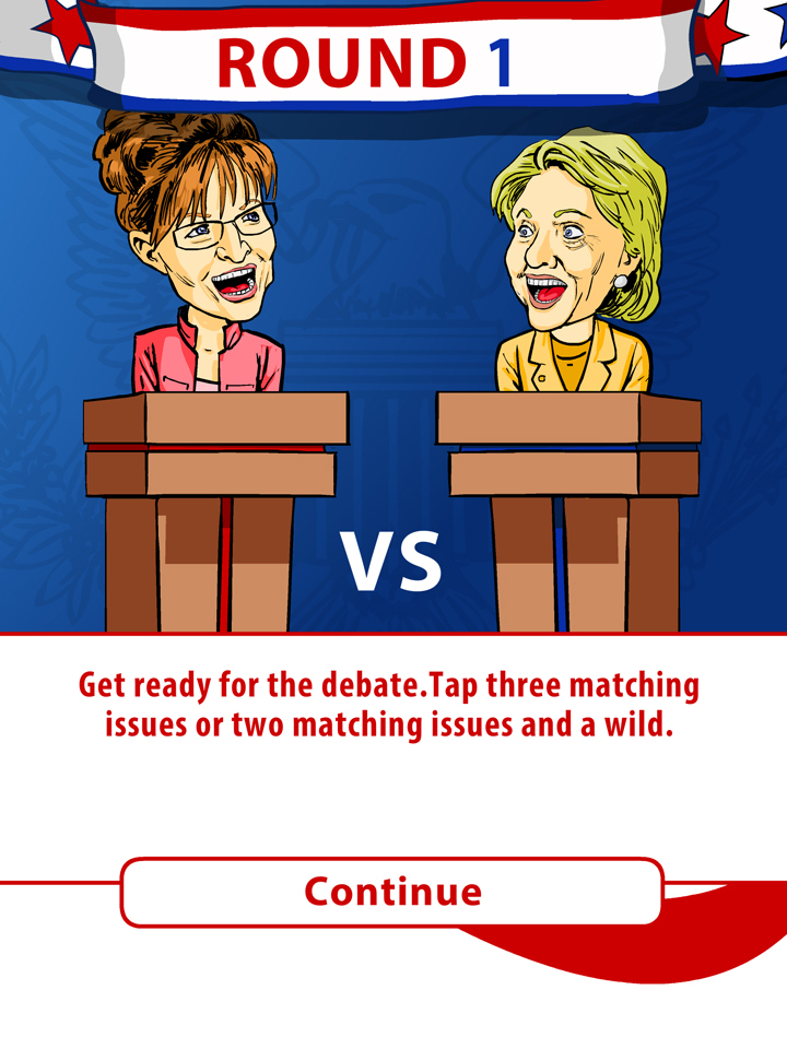 Players can choose between two game modes, “Campaign Trail” and “Never-Ending Debate.” The first mode sets players off on a series of debates with the candidate of their choosing, facing off against a cast of current, recent and historical political stars in themed debates across the country on the road to the White House. “Never-Ending Debate” tests the player’s endurance, challenging them to set a new high score against an infinite stream of opponents.