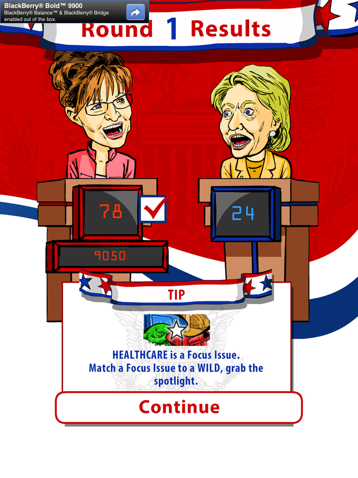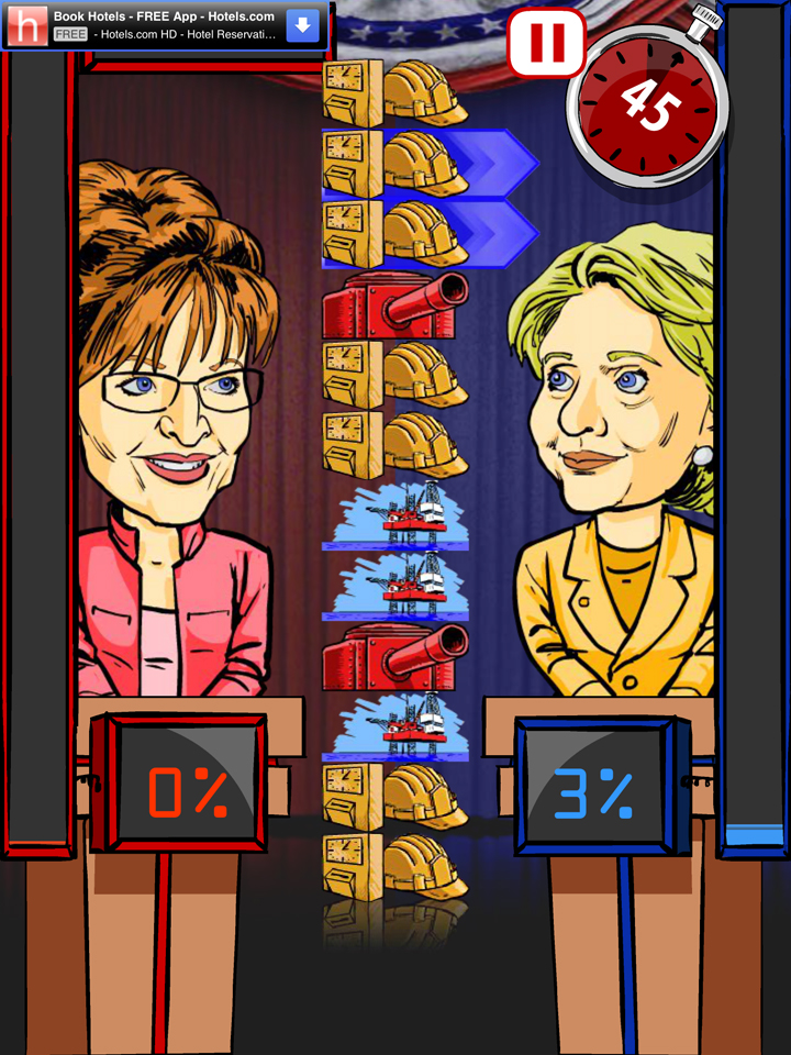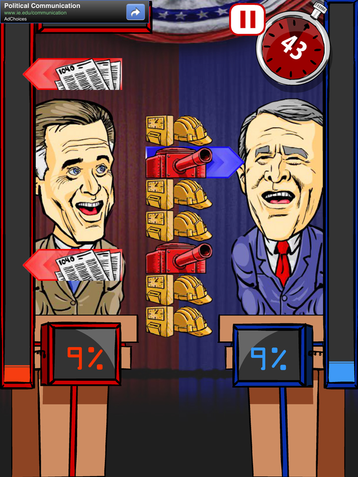 In Political Rampage, candidates create matches of key issues to battle their opponent and gain the approval of the audience. Occasionally a wildcard issue will appear; if selected as part of the match three, the politician will unleash one of four special powers upon the opponent, providing a hefty bonus and potentially winning the debate.