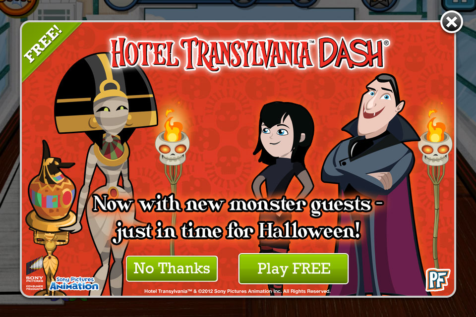 SAN FRANCISCO – Oct. 18, 2012 – PlayFirst® Inc. today announced a major expansion for Hotel Transylvania Dash® on iPhone, iPad and iPad touch that offers players two hot new venues and four monstrous new guests. In addition to the 30 action-packed levels that made Hotel Transylvania Dash the No. 1 free iPad game when it launched last month, patrons of Dracula’s five-stake resort can now try their hands – or claws, paws, or pincers – at running stylish new Hawaiian and Egyptian wings of the all-monster hotel. For the one million players who downloaded Hotel Transylvania Dash in just 20 days after its release, the updates are sure to be the perfect treat.