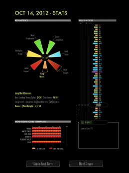 To give QatQi a unique feel, Garrett built the game’s puzzles around “maps” for players to explore, allowing them to uncover bonuses as they avoid barriers and link letters together. Corridors in the playing space grow narrower and more intricate as the game continues, making for an experience that’s easy to learn but offers a new kind of strategic depth for the genre. Elegant statistical breakdowns help novice word-slingers improve their scores, who can boast chart-topping performances with QatQi’s built-in social features.