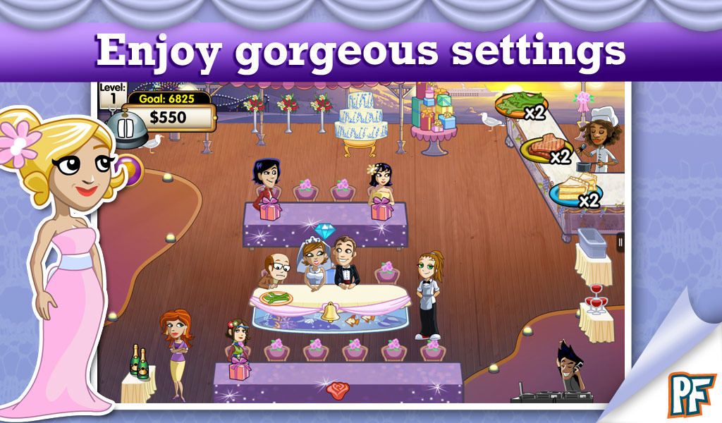 Wedding Dash stars aspiring wedding planner Quinn as she launches her own business designing receptions for picky brides and grooms. Players advance from organizing simple backyard weddings to planning elegant ballroom extravaganzas, choosing event details and managing hilarious disasters with PlayFirst’s groundbreaking time-management gameplay.