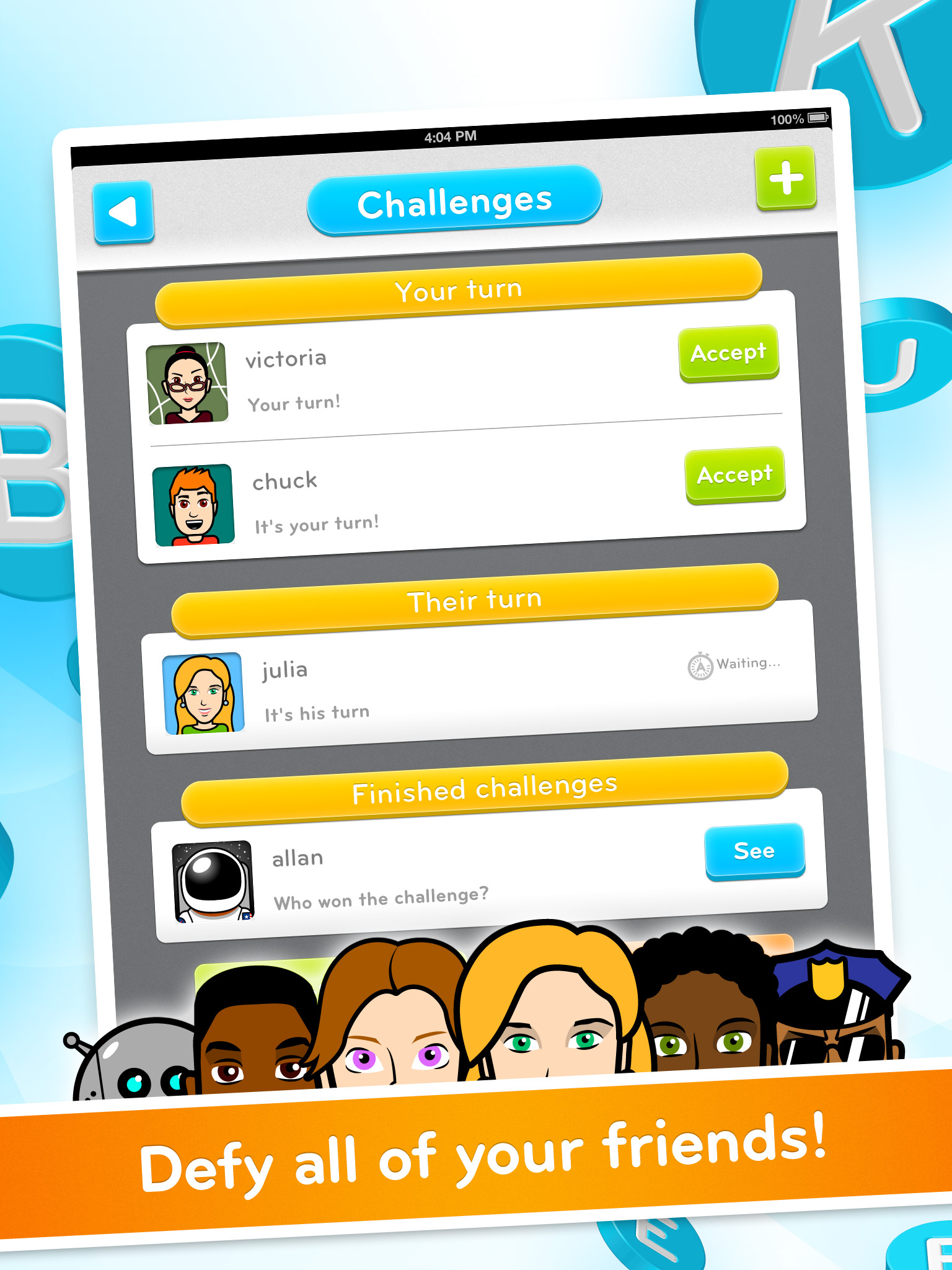- Challenge friends via Facebook, Twitter, Google+, e-mail, and text… or face off against one of 12 million random opponents.